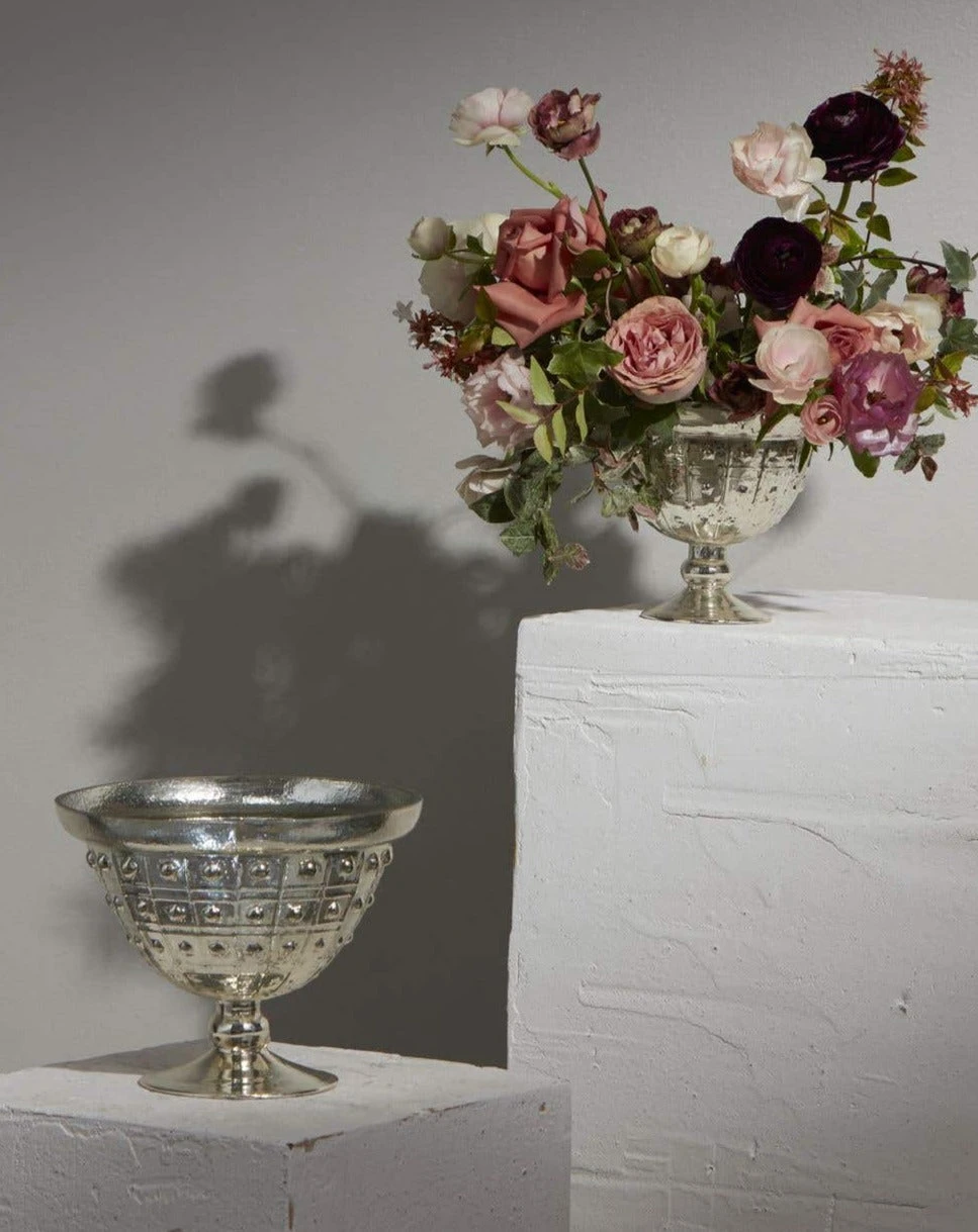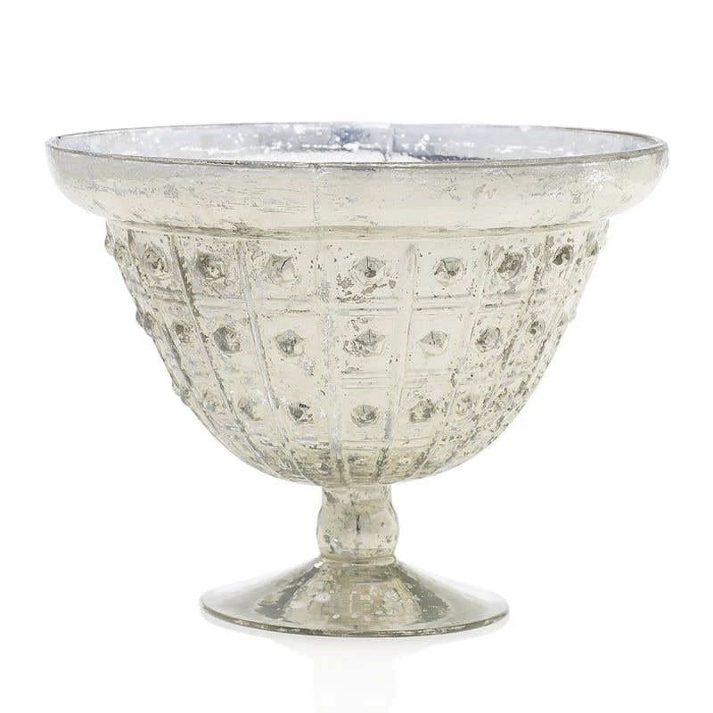 Bring some Renaissance flair to your home or event with this Glass Baleri Compote Bowl 8” x 6”! Fill with pale pink and white flowers for a romantic look, or for dramatic, Medieval style, use red and deep purple roses accented with natural branches. Pair this elevated warm silver vessel with cathedral candles for a tablescape that glows. This piece has a worn, antique-look coating on the outside that allows some light to shine through; and a raised texture design for added interest.Â