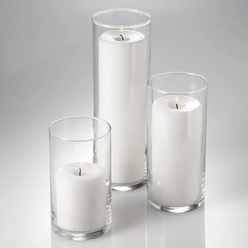 Our elegant, crystal clear Eastland Cylinder Vases make a beautiful presentation in any home or event space. With their simplicity and crystal clear quality glass, these hand-blown vases are a great way to display the twinkling light of pillar candles. With three sizes that add levels and dimension to your table, this set is perfect for any occasion or setting. Set includes 36 total vases – 12 of each size.