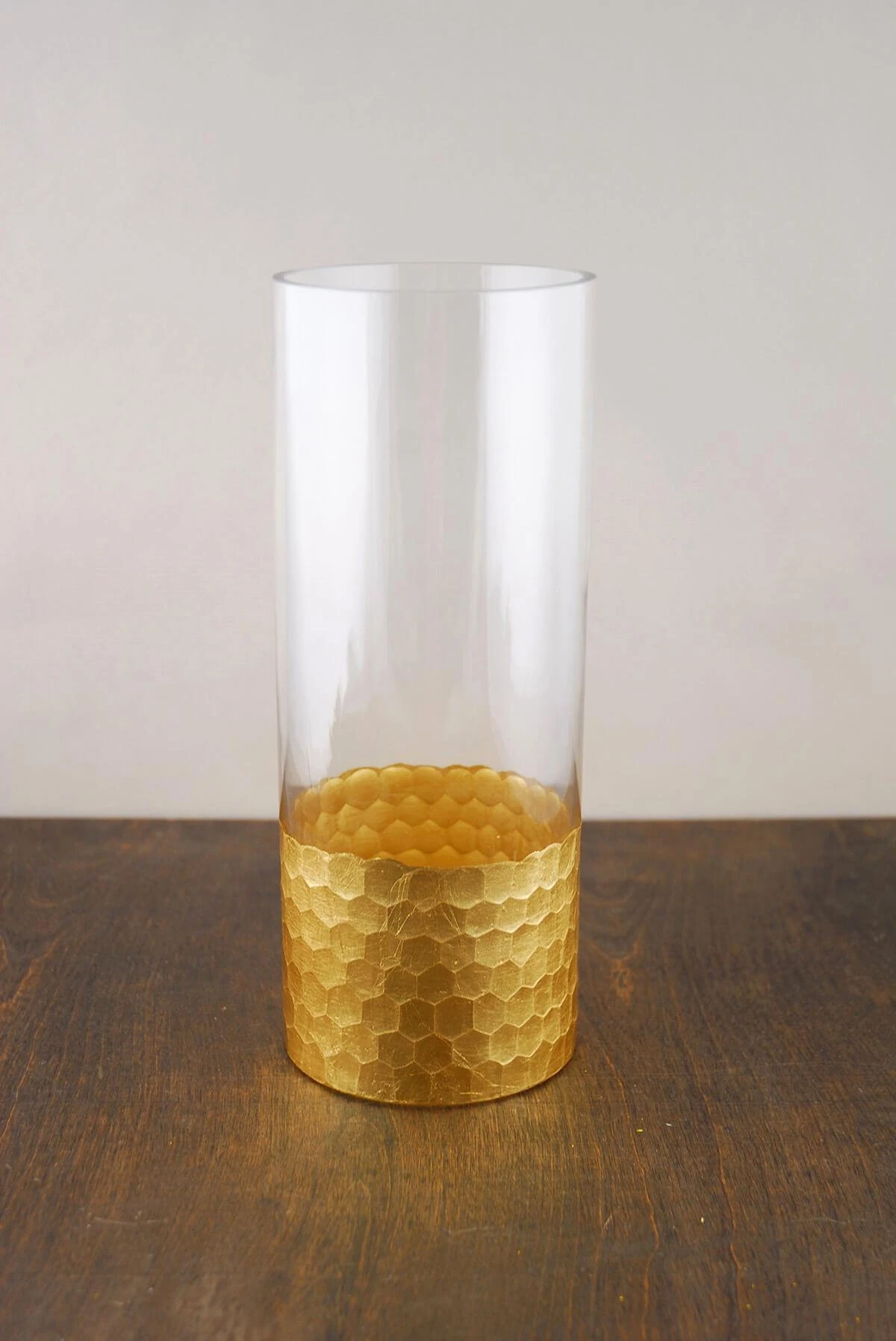 You will love this gorgeous Gold Honeycomb Cylinder Vase 10″. This versatile piece is perfect for tall flower arrangements or for use as a pillar candle holder! This clear glass cylinder vase has contemporary styling with a dimpled honeycomb pattern around the base. This glamorous gold-dipped vase is great choice for weddings and special events; or as a lovely accent piece in your upscale home!