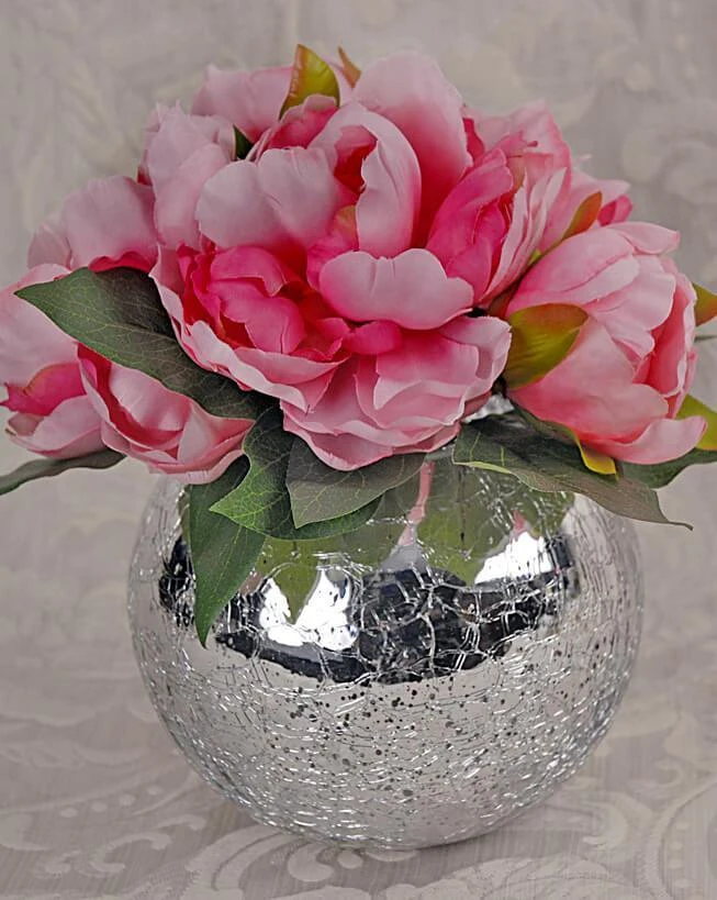 Bring an on-trend addition to your décor with the with the Mercury Glass Silver Ivy Bowl. With its glittering, crackled, metallic silver exterior, this reflective vase brings a celestial sparkle to your home or event. For an eye-catching display, fill the bowl with water and place floating candles inside; or add brightly colored florals for a real pop! Great option for modern-themed weddings, corporate events, restaurants, and home décor!
