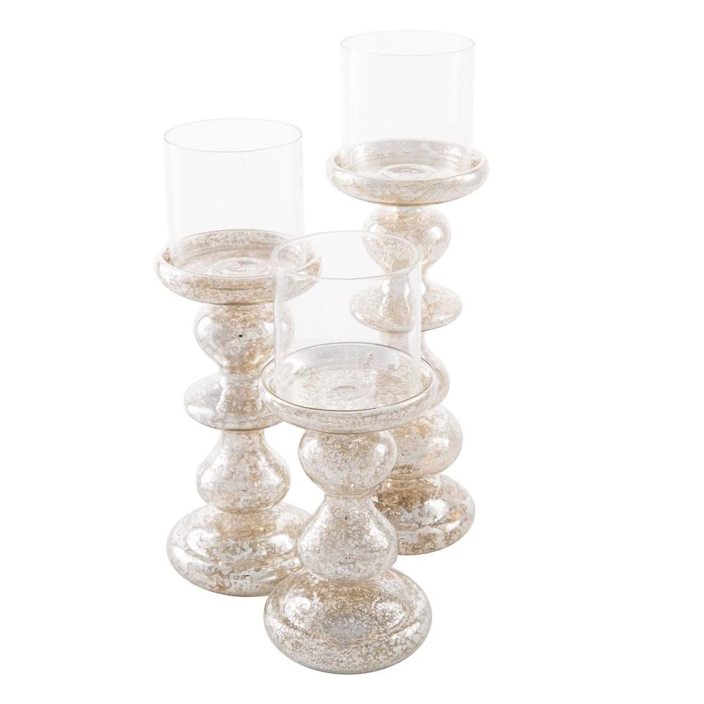 These lightweight glass holders have gentle curves and fabulous dappled iridescent mercury finish; and a dropped lip top. The graduated set of 1 of each size creates dimension and WOW – making this set a perfect choice for special events and in the home!