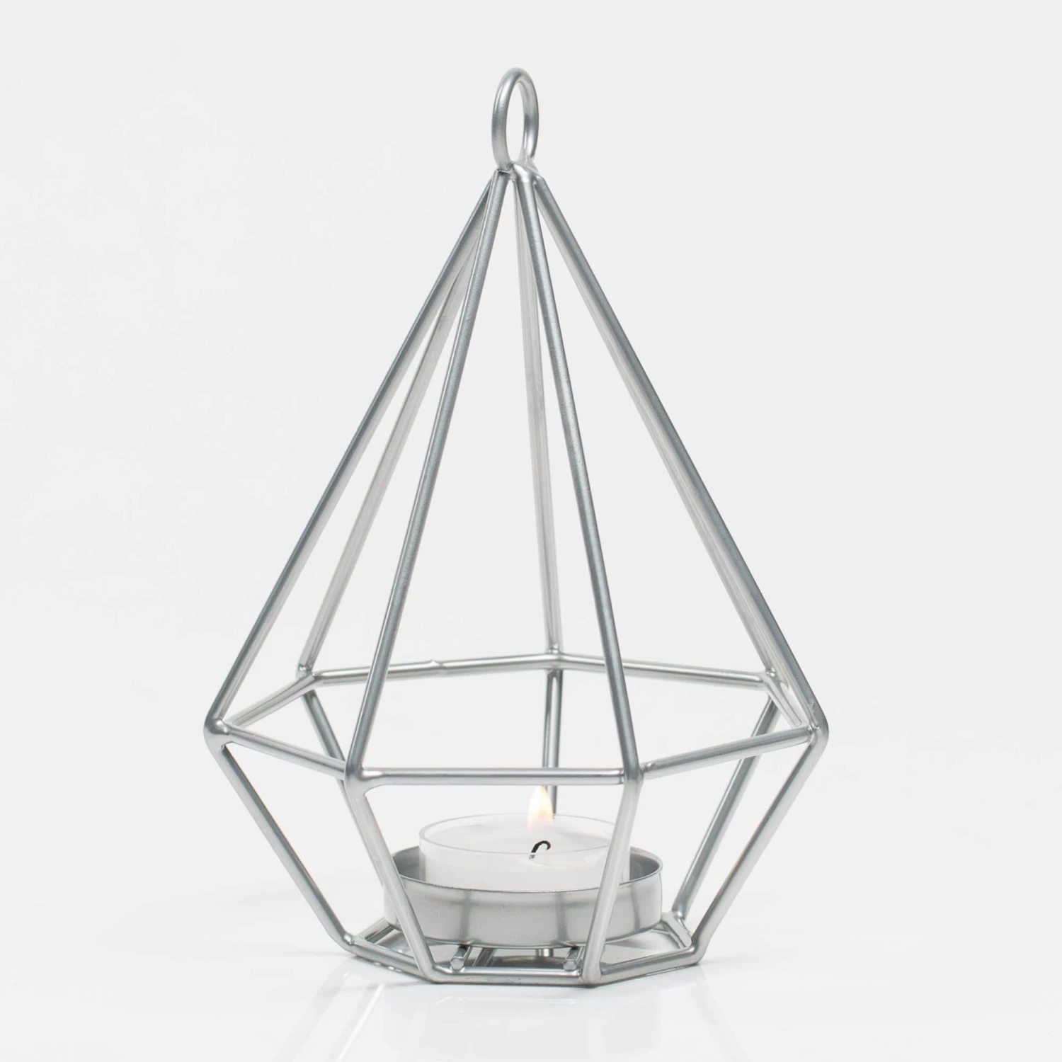 Our geometric tealight candle holders are edgy and fabulous! The simple open design allows for the candle light to glow from within – accentuating the cool metal shape! With the top loop, these not only can be stand-alone pieces of intrigue in table design; but you can also hang these holders from one of our shepherd hooks to enhance any entry way or path. A great option for a modern wedding, event, office, patio, or backyard!