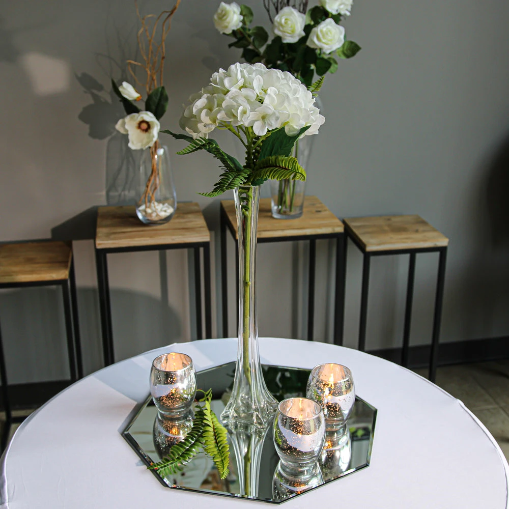 This is a hurricane you will love! Our classic grande hurricane holder got a glitzy makeover in a lovely silver mercury dappled finish. The substantial size, reflective finish, and elegant oval shape of this glass holder makes it a customer favorite for events and home alike! With an added glow of twinkling candlelight from within the mercury finish, your guests are sure to be impressed and delighted. Or, add your favorite gorgeous bloom to create a stunning mini vase.