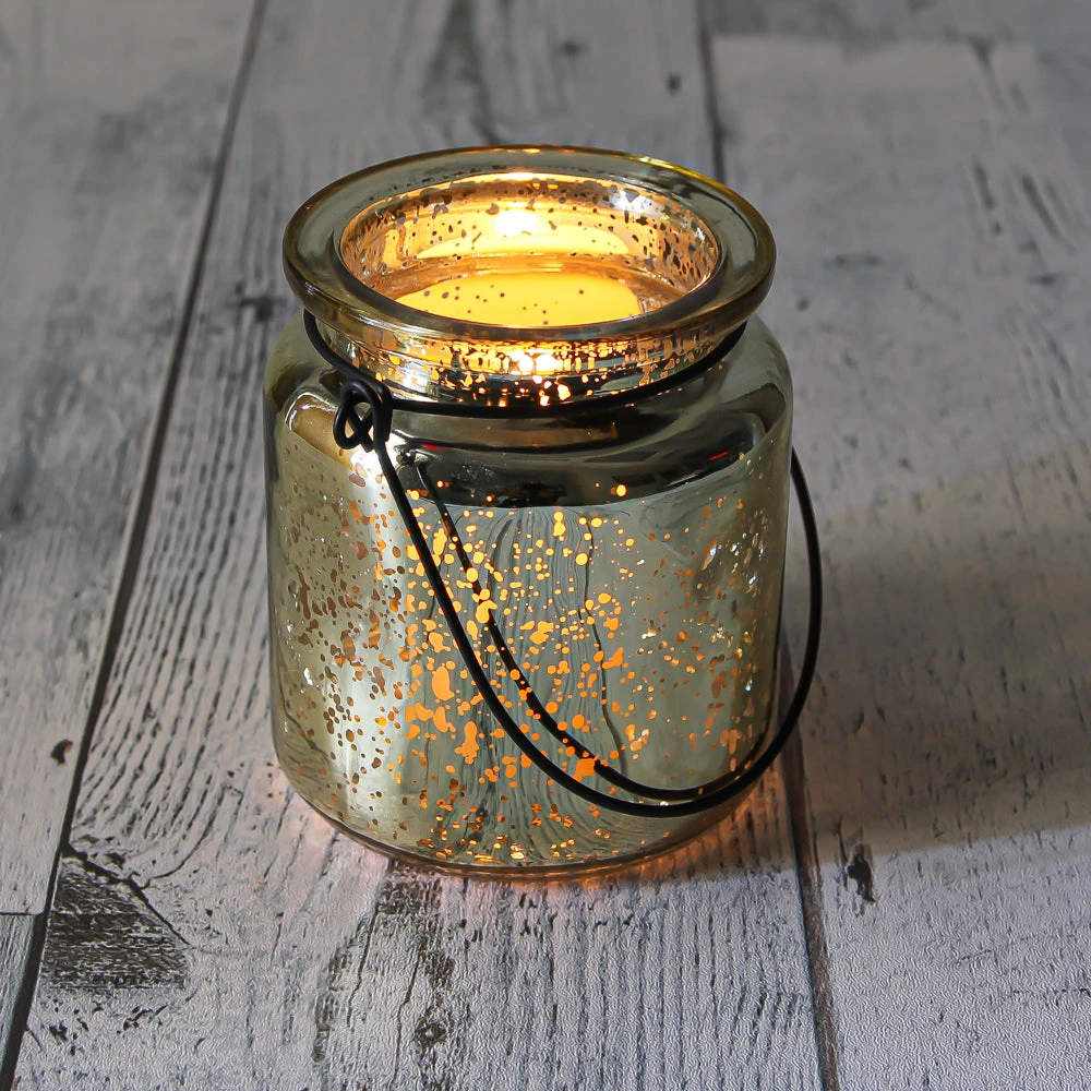 These fabulous hanging mercury glass holders can be just the right touch for your home or event! These thick glass vessels features a reflective dappled metallic finish, elegant shape, and brushed black metal handle. When using with our Richland Tealight or Votive Candles, the shimmer and glow through the speckled finish will brighten any spot! Perfect for weddings, events, and home décor!
