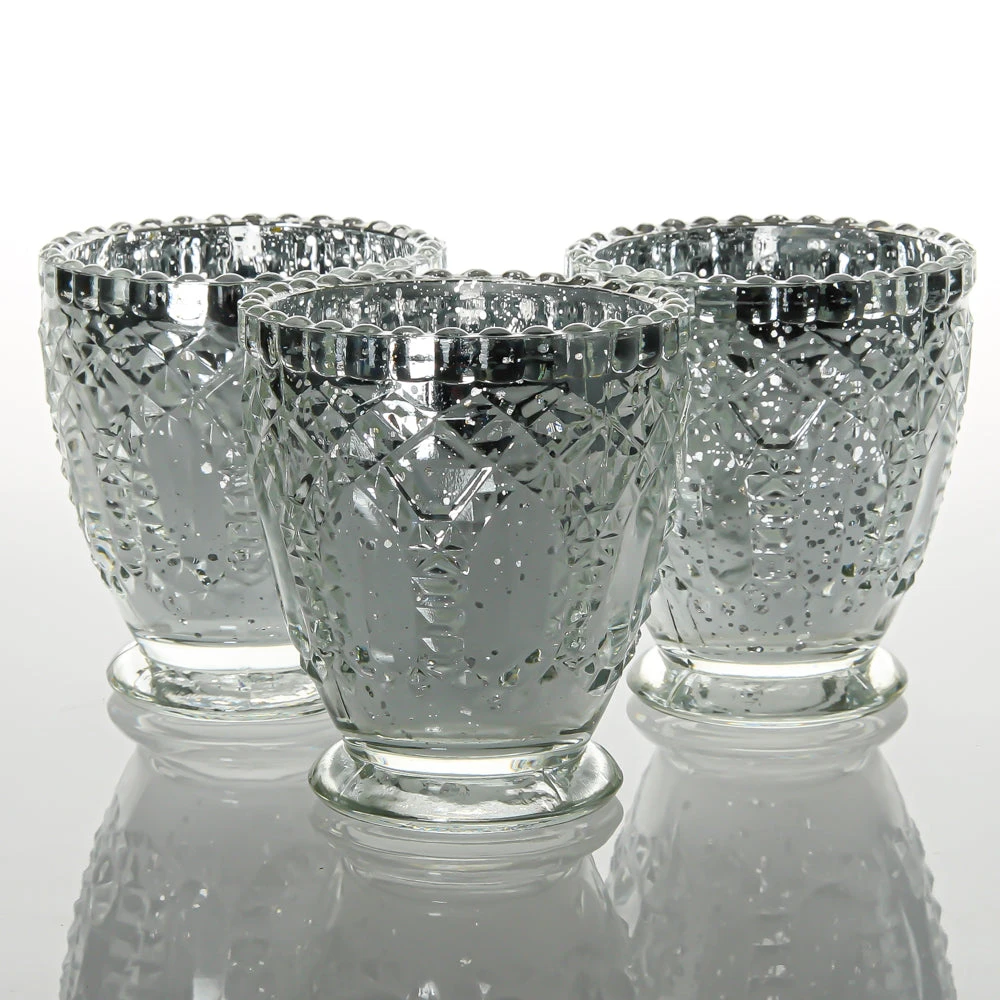 This royally-inspired glass holder has a intricate, detailed design and glimmering silver mercury finish that makes this piece a must-have for home or event! The glass beading detail on the rim of the holder leads into a lovely tapered-shape textured body and elegant base. Once filled with a candle, the glow through the shining dappled finish is breathtaking! A perfect choice for weddings, dinner parties, restaurants, and upscale décor!Â