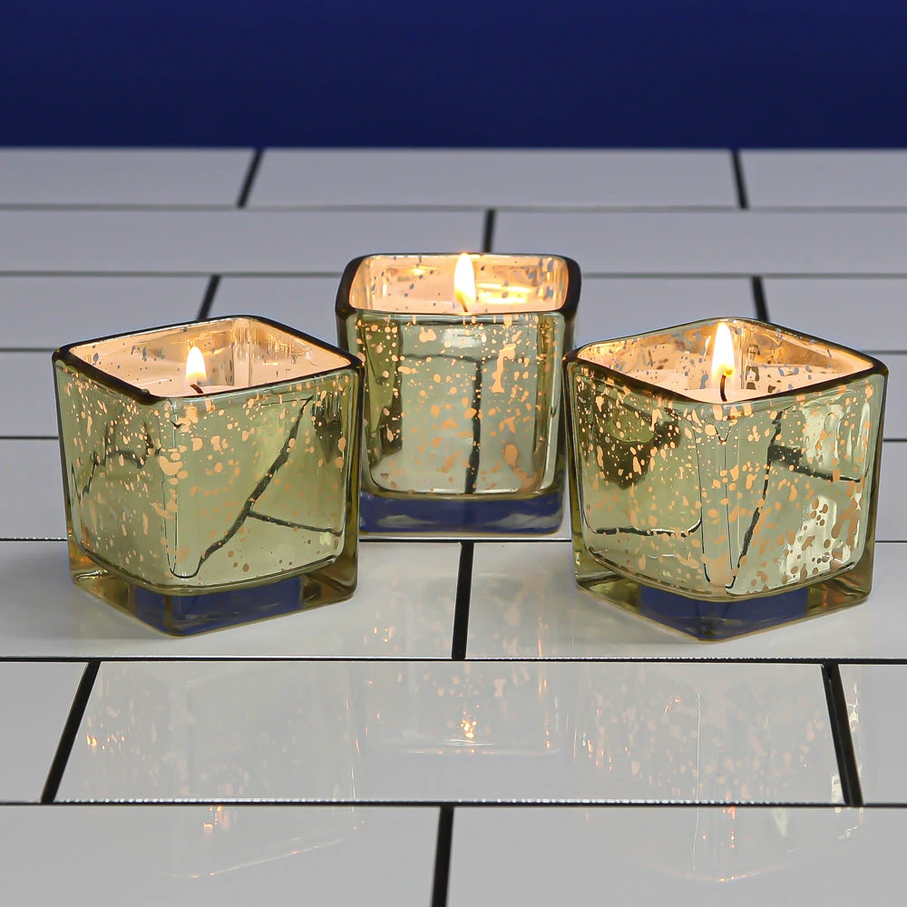This fabulous addition to our square holder category will delight! The dazzling effect of candlelight inside a light gold dappled mercury holder is simply stunning. This thick glass holder in a square shape provides modern beauty in your home or event space. This holder is beautifully reflective and will take on colors and characteristics of its surroundings. With an option of metallic gold, amber gold, silver, and rose gold mercury, it’s easy to mix and match or choose the one perfect for your theme or setting. Simple, elegant, and affordable make this votive holder a great choice!