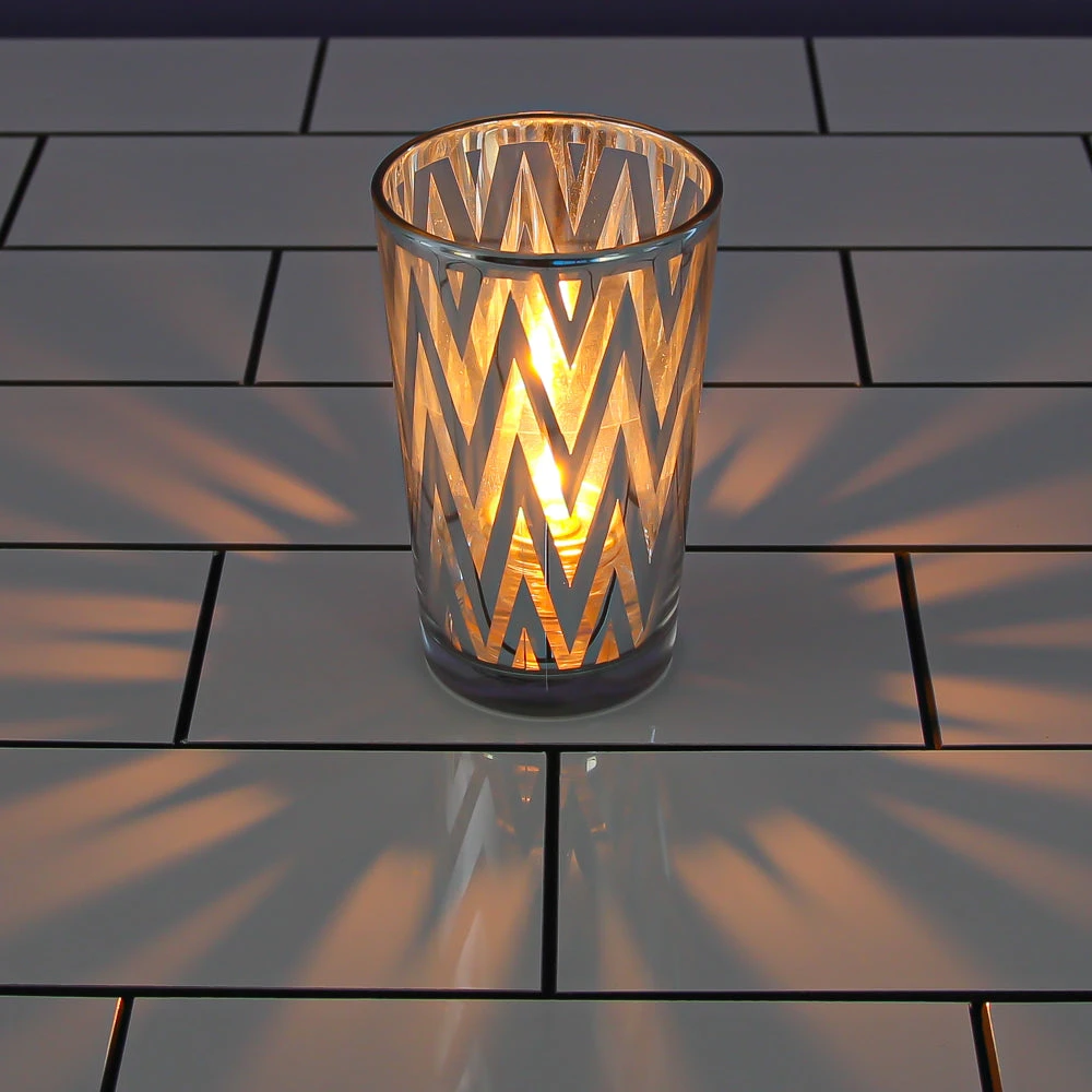 Metallics are in! Our fabulous line of silver, gold, and rose gold metallic glass holders will make your home or event a little more magical. This tall and narrow holder features quality glass, a silver metallic chevron design, and elegant tapered shape. Add our Richland Votive or Tealight Candle options to complete your look (candles not included). Candlelight illuminates the holder, creating enchanting zigs and zags of light, sure to enhance any setting.